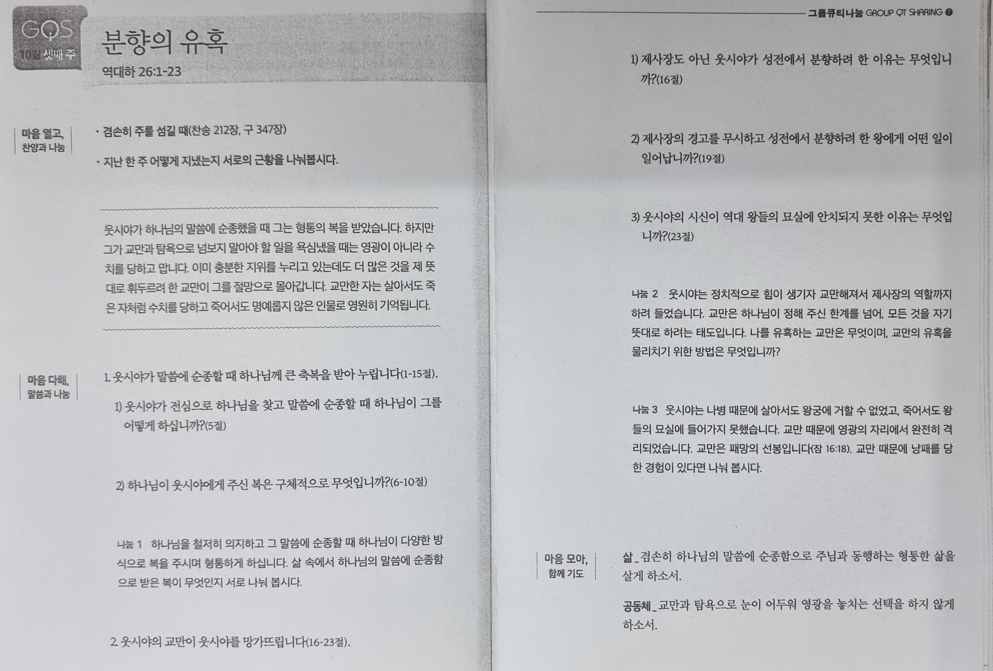 본 영상의 사이즈와 화질은 500kbps, 중간화질입니다. 영상은 업로드 시 설정할 수 있습니다. [성경본문] 역대하26:1-23절 개역개정1. 유다 온 백성이 나이가 십육 세 된 웃시야를 세워 그의 아버지 아마샤를 대신하여 왕으로 삼으니 2. 아마샤 왕이 그의 열조들의 묘실에 누운 후에 웃시야가 엘롯을 건축하여 유다에 돌렸더라 3. 웃시야가 왕위에 오를 때에 나이가 십육 세라 예루살렘에서 오십이 년 간 다스리니라 그의 어머니의 이름은 여골리아요 예루살렘 사람이더라 4. 웃시야가 그의 아버지 아마샤의 모든 행위대로 여호와 보시기에 정직하게 행하며 5. 하나님의 묵시를 밝히 아는 스가랴가 사는 날에 하나님을 찾았고 그가 여호와를 찾을 동안에는 하나님이 형통하게 하셨더라 6. 웃시야가 나가서 블레셋 사람들과 싸우고 가드 성벽과 야브네 성벽과 아스돗 성벽을 헐고 아스돗 땅과 블레셋 사람들 가운데에 성읍들을 건축하매 7. 하나님이 그를 도우사 블레셋 사람들과 구르바알에 거주하는 아라비아 사람들과 마온 사람들을 치게 하신지라 8. 암몬 사람들이 웃시야에게 조공을 바치매 웃시야가 매우 강성하여 이름이 애굽 변방까지 퍼졌더라 9. 웃시야가 예루살렘에서 성 모퉁이 문과 골짜기 문과 성굽이에 망대를 세워 견고하게 하고 10. 또 광야에 망대를 세우고 물 웅덩이를 많이 파고 고원과 평지에 가축을 많이 길렀으며 또 여러 산과 좋은 밭에 농부와 포도원을 다스리는 자들을 두었으니 농사를 좋아함이었더라 11. 웃시야에게 또 싸우는 군사가 있으니 서기관 여이엘과 병영장 마아세야가 직접 조사한 수효대로 왕의 지휘관 하나냐의 휘하에 속하여 떼를 지어 나가서 싸우는 자라 12. 족장의 총수가 이천육백 명이니 모두 큰 용사요 13. 그의 휘하의 군대가 삼십만 칠천오백 명이라 건장하고 싸움에 능하여 왕을 도와 적을 치는 자이며 14. 웃시야가 그의 온 군대를 위하여 방패와 창과 투구와 갑옷과 활과 물매 돌을 준비하고 15. 또 예루살렘에서 재주 있는 사람들에게 무기를 고안하게 하여 망대와 성곽 위에 두어 화살과 큰 돌을 쏘고 던지게 하였으니 그의 이름이 멀리 퍼짐은 기이한 도우심을 얻어 강성하여짐이었더라 16. 그가 강성하여지매 그의 마음이 교만하여 악을 행하여 그의 하나님 여호와께 범죄하되 곧 여호와의 성전에 들어가서 향단에 분향 17. 제사장 아사랴가 여호와의 용맹한 제사장 팔십 명을 데리고 그의 뒤를 따라 들어가서 18. 웃시야 왕 곁에 서서 그에게 이르되 웃시야여 여호와께 분향하는 일은 왕이 할 바가 아니요 오직 분향하기 위하여 구별함을 받은 아론의 자손 제사장들이 할 바니 성소에서 나가소서 왕이 범죄하였으니 하나님 여호와에게서 영광을 얻지 못하리이다 19. 웃시야가 손으로 향로를 잡고 분향하려 하다가 화를 내니 그가 제사장에게 화를 낼 때에 여호와의 전 안 향단 곁 제사장들 앞에서 그의 이마에 나병이 생긴지라 20. 대제사장 아사랴와 모든 제사장이 왕의 이마에 나병이 생겼음을 보고 성전에서 급히 쫓아내고 여호와께서 치시므로 왕도 속히 나가니라 21. 웃시야 왕이 죽는 날까지 나병환자가 되었고 나병환자가 되매 여호와의 전에서 끊어져 별궁에 살았으므로 그의 아들 요담이 왕궁을 관리하며 백성을 다스렸더라 22. 웃시야의 남은 시종 행적은 아모스의 아들 선지자 이사야가 기록하였더라 23. 웃시야가 그의 조상들과 함께 누우매 그는 나병환자라 하여 왕들의 묘실에 접한 땅 곧 그의 조상들의 곁에 장사하니라 그의 아들 요담이 대신하여 왕이 되니라 2025년 10월 셋째주 순장반공부 「분향의 유혹」
