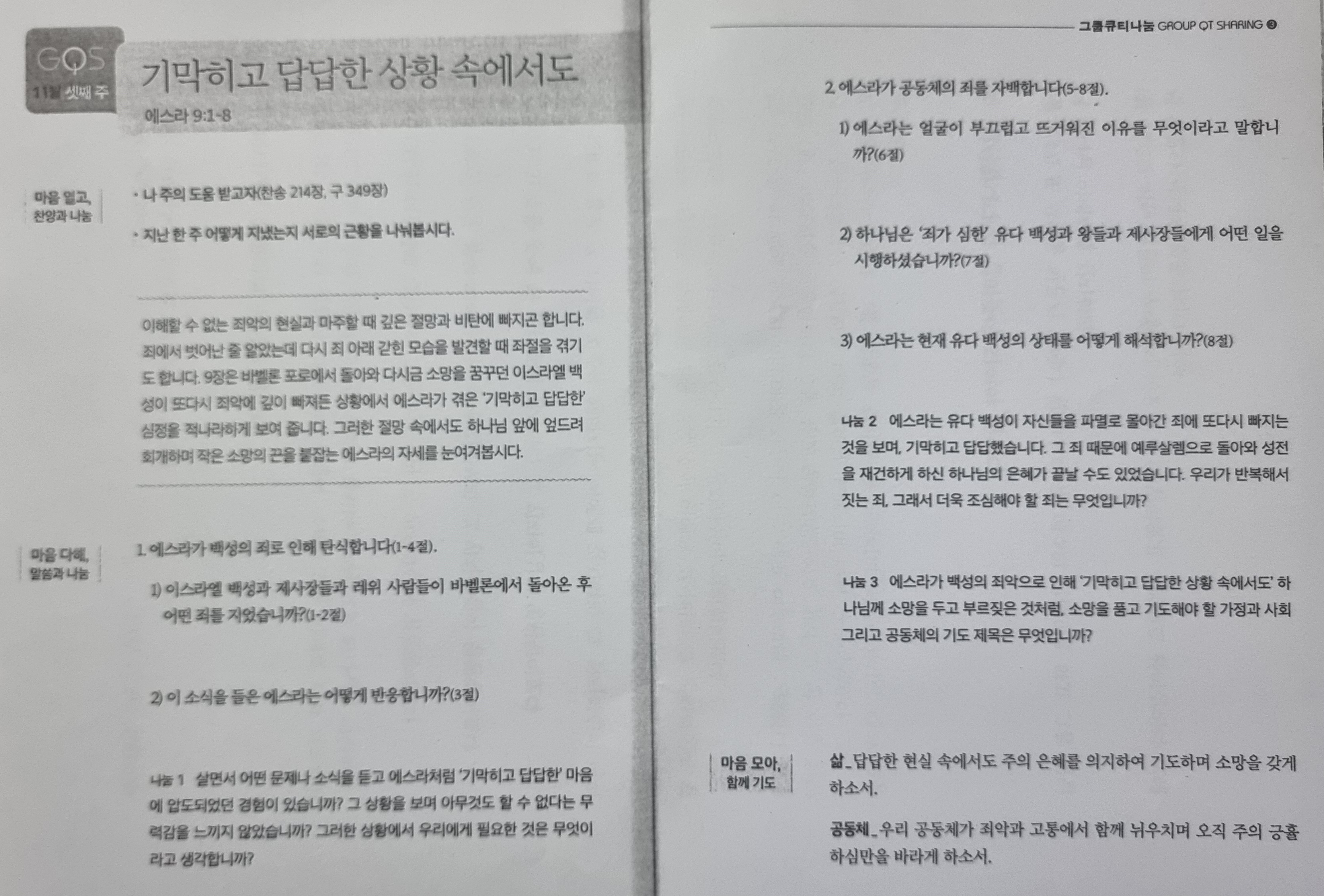 본 영상의 사이즈와 화질은 500kbps, 중간화질입니다. 영상은 업로드 시 설정할 수 있습니다. [성경본문] 에스라9:1-8절 개역개정1. 이 일 후에 방백들이 내게 나아와 이르되 이스라엘 백성과 제사장들과 레위 사람들이 이 땅 백성들에게서 떠나지 아니하고 가나안 2. 그들의 딸을 맞이하여 아내와 며느리로 삼아 거룩한 자손이 그 지방 사람들과 서로 섞이게 하는데 방백들과 고관들이 이 죄에 더욱 으뜸이 되었다 하는지라 3. 내가 이 일을 듣고 속옷과 겉옷을 찢고 머리털과 수염을 뜯으며 기가 막혀 앉으니 4. 이에 이스라엘의 하나님의 말씀으로 말미암아 떠는 자가 사로잡혔던 이 사람들의 죄 때문에 다 내게로 모여오더라 내가 저녁 제사 드릴 때까지 기가 막혀 앉았더니 5. 저녁 제사를 드릴 때에 내가 근심 중에 일어나서 속옷과 겉옷을 찢은 채 무릎을 꿇고 나의 하나님 여호와를 향하여 손을 들고 6. 말하기를 나의 하나님이여 내가 부끄럽고 낯이 뜨거워서 감히 나의 하나님을 향하여 얼굴을 들지 못하오니 이는 우리 죄악이 많아 정수리에 넘치고 우리 허물이 커서 하늘에 미침이니이다 7. 우리 조상들의 때로부터 오늘까지 우리의 죄가 심하매 우리의 죄악으로 말미암아 우리와 우리 왕들과 우리 제사장들을 여러 나라 왕들의 손에 넘기사 칼에 죽으며 사로잡히며 노략을 당하며 얼굴을 부끄럽게 하심이 오늘날과 같으니이다 8. 이제 우리 하나님 여호와께서 우리에게 잠시 동안 은혜를 베푸사 얼마를 남겨 두어 피하게 하신 우리를 그 거룩한 처소에 박힌 못과 같게 하시고 우리 하나님이 우리 눈을 밝히사 우리가 종노릇 하는 중에서 조금 소생하게 하셨나이다 2025년 11월 셋째주 순장반공부 「기막히고 답답한 상황 속에서도」