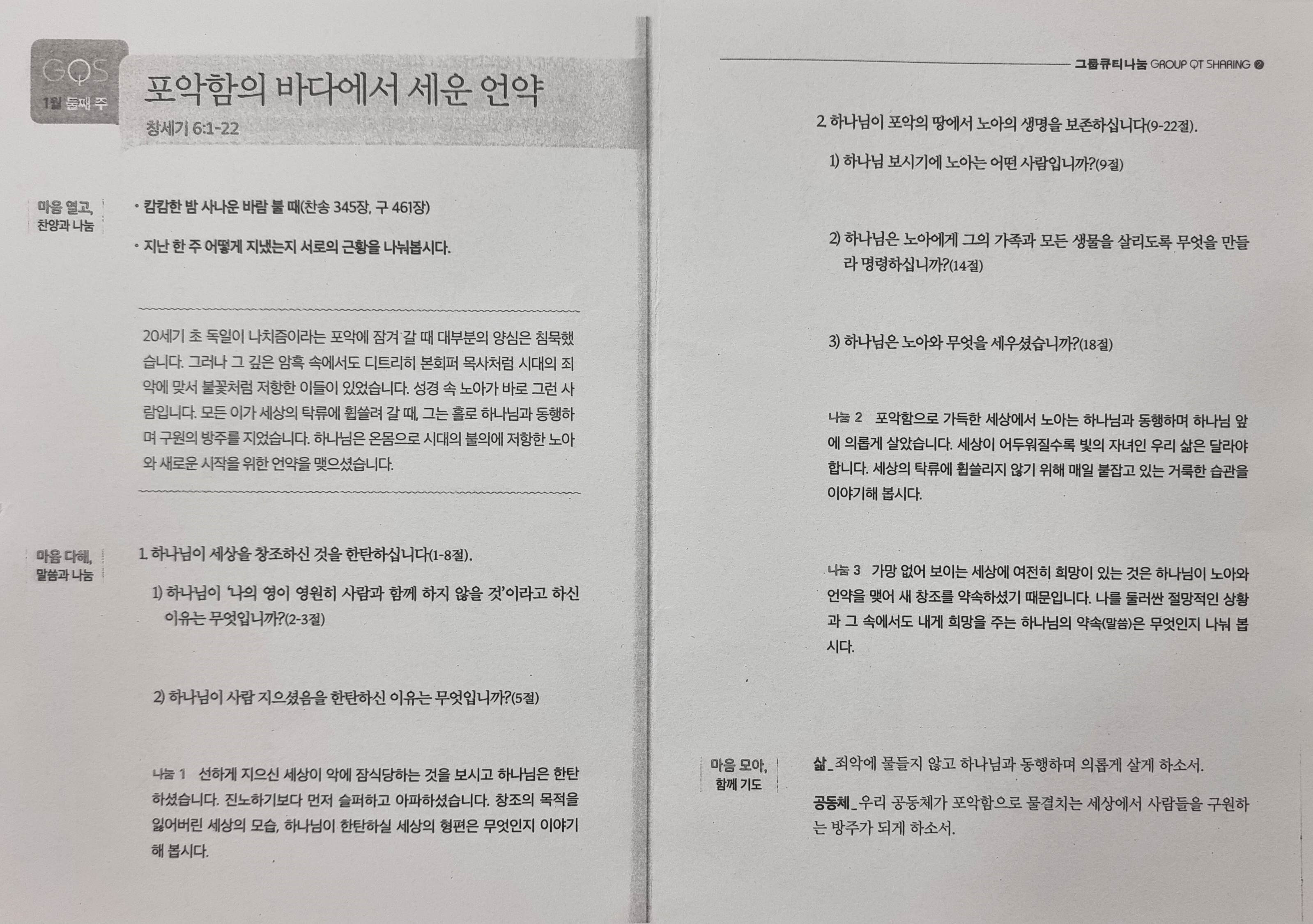 본 영상의 사이즈와 화질은 500kbps, 중간화질입니다. 영상은 업로드 시 설정할 수 있습니다. [성경본문] 창세기6:1-22절 개역개정1. 사람이 땅 위에 번성하기 시작할 때에 그들에게서 딸들이 나니 2. 하나님의 아들들이 사람의 딸들의 아름다움을 보고 자기들이 좋아하는 모든 여자를 아내로 삼는지라 3. 여호와께서 이르시되 나의 영이 영원히 사람과 함께 하지 아니하리니 이는 그들이 육신이 됨이라 그러나 그들의 날은 백이십 년이 되리라 하시니라 4. 당시에 땅에는 네피림이 있었고 그 후에도 하나님의 아들들이 사람의 딸들에게로 들어와 자식을 낳았으니 그들은 용사라 고대에 명성이 있는 사람들이었더라 5. 여호와께서 사람의 죄악이 세상에 가득함과 그의 마음으로 생각하는 모든 계획이 항상 악할 뿐임을 보시고 6. 땅 위에 사람 지으셨음을 한탄하사 마음에 근심하시고 7. 이르시되 내가 창조한 사람을 내가 지면에서 쓸어버리되 사람으로부터 가축과 기는 것과 공중의 새까지 그리하리니 이는 내가 그것들을 지었음을 한탄함이니라 하시니라 8. 그러나 노아는 여호와께 은혜를 입었더라 9. 이것이 노아의 족보니라 노아는 의인이요 당대에 완전한 자라 그는 하나님과 동행하였으며 10. 세 아들을 낳았으니 셈과 함과 야벳이라 11. 그 때에 온 땅이 하나님 앞에 부패하여 포악함이 땅에 가득한지라 12. 하나님이 보신즉 땅이 부패하였으니 이는 땅에서 모든 혈육 있는 자의 행위가 부패함이었더라 13. 하나님이 노아에게 이르시되 모든 혈육 있는 자의 포악함이 땅에 가득하므로 그 끝 날이 내 앞에 이르렀으니 내가 그들을 땅과 함께 멸하리라 14. 너는 고페르 나무로 너를 위하여 방주를 만들되 그 안에 칸들을 막고 역청을 그 안팎에 칠하라 15. 네가 만들 방주는 이러하니 그 길이는 삼백 규빗, 너비는 오십 규빗, 높이는 삼십 규빗이라 16. 거기에 창을 내되 위에서부터 한 규빗에 내고 그 문은 옆으로 내고 상 중 하 삼층으로 할지니라 17. 내가 홍수를 땅에 일으켜 무릇 생명의 기운이 있는 모든 육체를 천하에서 멸절하리니 땅에 있는 것들이 다 죽으리라 18. 그러나 너와는 내가 내 언약을 세우리니 너는 네 아들들과 네 아내와 네 며느리들과 함께 그 방주로 들어가고 19. 혈육 있는 모든 생물을 너는 각기 암수 한 쌍씩 방주로 이끌어들여 너와 함께 생명을 보존하게 하되 20. 새가 그 종류대로, 가축이 그 종류대로, 땅에 기는 모든 것이 그 종류대로 각기 둘씩 네게로 나아오리니 그 생명을 보존하게 하라 21. 너는 먹을 모든 양식을 네게로 가져다가 저축하라 이것이 너와 그들의 먹을 것이 되리라 22. 노아가 그와 같이 하여 하나님이 자기에게 명하신 대로 다 준행하였더라 2026년 1월 둘째주 순장반 공부 「포악함의 바다에서 세운언약」