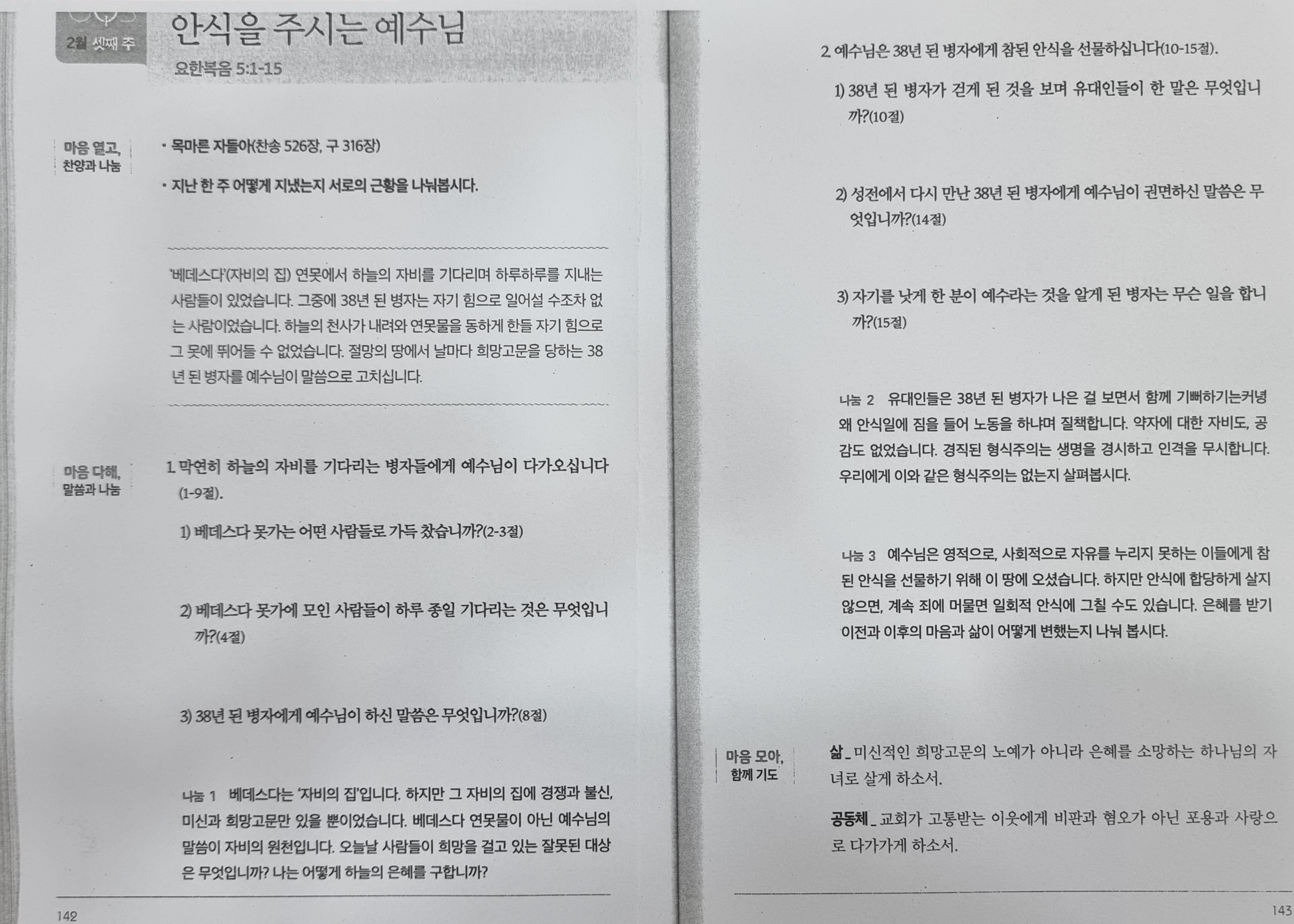 본 영상의 사이즈와 화질은 500kbps, 중간화질입니다. 영상은 업로드 시 설정할 수 있습니다. [성경본문] 요한복음5:1-15절 개역개정1. 그 후에 유대인의 명절이 되어 예수께서 예루살렘에 올라가시니라 2. 예루살렘에 있는 양문 곁에 히브리 말로 베데스다라 하는 못이 있는데 거기 행각 다섯이 있고 3. 그 안에 많은 병자, 맹인, 다리 저는 사람, 혈기 마른 사람들이 누워 [물의 움직임을 기다리니 4. 이는 천사가 가끔 못에 내려와 물을 움직이게 하는데 움직인 후에 먼저 들어가는 자는 어떤 병에 걸렸든지 낫게 됨이러라] 5. 거기 서른여덟 해 된 병자가 있더라 6. 예수께서 그 누운 것을 보시고 병이 벌써 오래된 줄 아시고 이르시되 네가 낫고자 하느냐 7. 병자가 대답하되 주여 물이 움직일 때에 나를 못에 넣어 주는 사람이 없어 내가 가는 동안에 다른 사람이 먼저 내려가나이다 8. 예수께서 이르시되 일어나 네 자리를 들고 걸어가라 하시니 9. 그 사람이 곧 나아서 자리를 들고 걸어가니라 이 날은 안식일이니 10. 유대인들이 병 나은 사람에게 이르되 안식일인데 네가 자리를 들고 가는 것이 옳지 아니하니라 11. 대답하되 나를 낫게 한 그가 자리를 들고 걸어가라 하더라 하니 12. 그들이 묻되 너에게 자리를 들고 걸어가라 한 사람이 누구냐 하되 13. 고침을 받은 사람은 그가 누구인지 알지 못하니 이는 거기 사람이 많으므로 예수께서 이미 피하셨음이라 14. 그 후에 예수께서 성전에서 그 사람을 만나 이르시되 보라 네가 나았으니 더 심한 것이 생기지 않게 다시는 죄를 범하지 말라 하시니 15. 그 사람이 유대인들에게 가서 자기를 고친 이는 예수라 하니라 2026년 2월 셋째주 순장반 공부 「안식을 주시는 예수님」