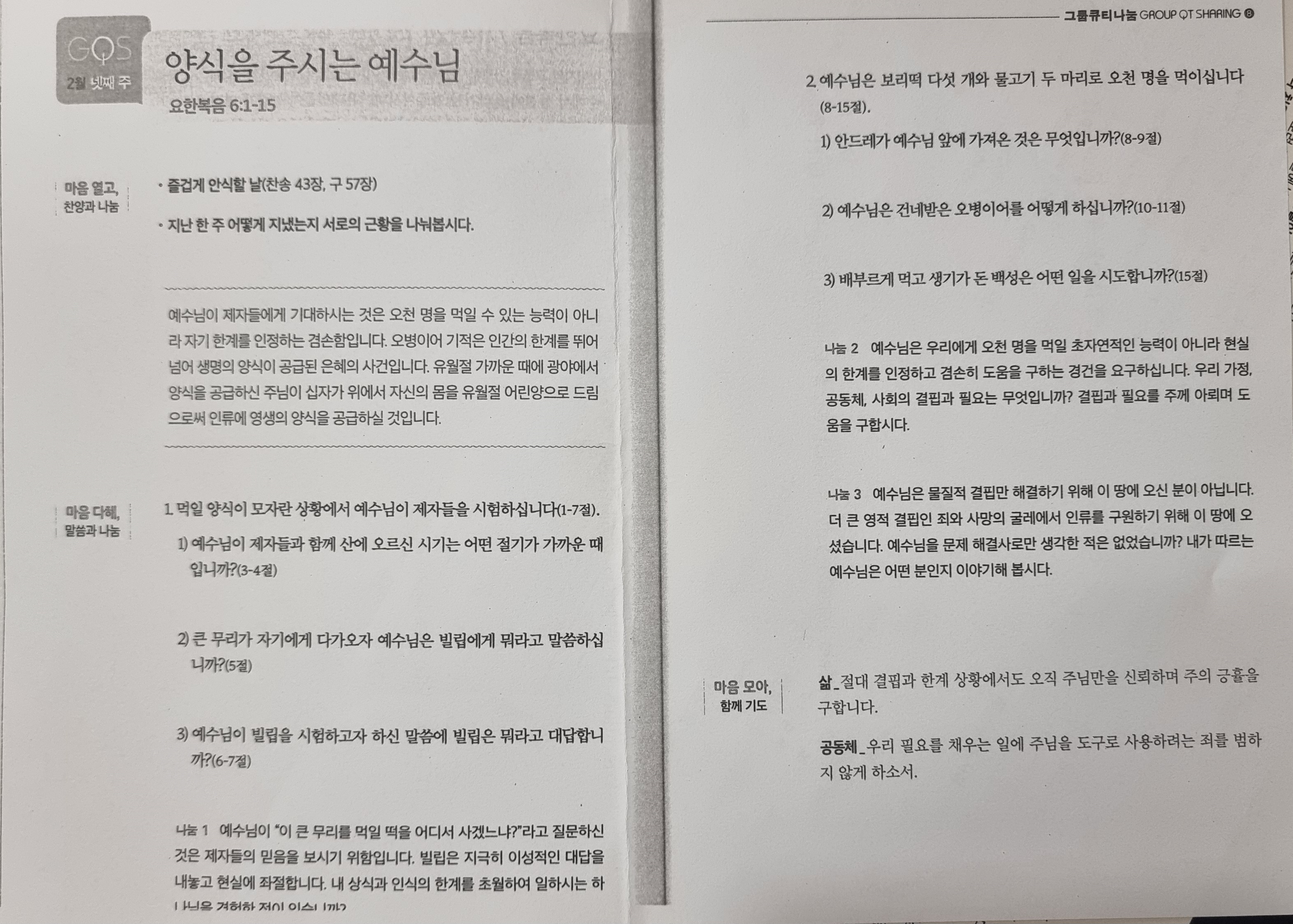 본 영상의 사이즈와 화질은 500kbps, 중간화질입니다. 영상은 업로드 시 설정할 수 있습니다. [성경본문] 요한복음6:1-15절 개역개정1. 그 후에 예수께서 디베랴의 갈릴리 바다 건너편으로 가시매 2. 큰 무리가 따르니 이는 병자들에게 행하시는 표적을 보았음이러라 3. 예수께서 산에 오르사 제자들과 함께 거기 앉으시니 4. 마침 유대인의 명절인 유월절이 가까운지라 5. 예수께서 눈을 들어 큰 무리가 자기에게로 오는 것을 보시고 빌립에게 이르시되 우리가 어디서 떡을 사서 이 사람들을 먹이겠느냐 하시니 6. 이렇게 말씀하심은 친히 어떻게 하실지를 아시고 빌립을 시험하고자 하심이라 7. 빌립이 대답하되 각 사람으로 조금씩 받게 할지라도 이백 데나리온의 떡이 부족하리이다 8. 제자 중 하나 곧 시몬 베드로의 형제 안드레가 예수께 여짜오되 9. 여기 한 아이가 있어 보리떡 다섯 개와 물고기 두 마리를 가지고 있나이다 그러나 그것이 이 많은 사람에게 얼마나 되겠사옵나이까 10. 예수께서 이르시되 이 사람들로 앉게 하라 하시니 그 곳에 잔디가 많은지라 사람들이 앉으니 수가 오천 명쯤 되더라 11. 예수께서 떡을 가져 축사하신 후에 앉아 있는 자들에게 나눠 주시고 물고기도 그렇게 그들의 원대로 주시니라 12. 그들이 배부른 후에 예수께서 제자들에게 이르시되 남은 조각을 거두고 버리는 것이 없게 하라 하시므로 13. 이에 거두니 보리떡 다섯 개로 먹고 남은 조각이 열두 바구니에 찼더라 14. 그 사람들이 예수께서 행하신 이 표적을 보고 말하되 이는 참으로 세상에 오실 그 선지자라 하더라 15. 그러므로 예수께서 그들이 와서 자기를 억지로 붙들어 임금으로 삼으려는 줄 아시고 다시 혼자 산으로 떠나 가시니라 2026년 2월 넷째주 순장반 공부 「양식을 주시는 예수님」