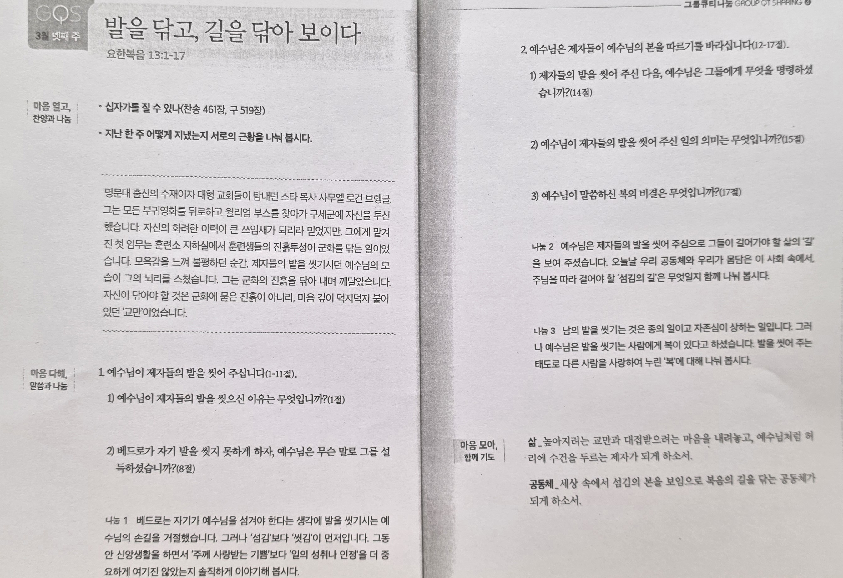 본 영상의 사이즈와 화질은 500kbps, 중간화질입니다. 영상은 업로드 시 설정할 수 있습니다. [성경본문] 요한복음13:1-17절 개역개정1. 유월절 전에 예수께서 자기가 세상을 떠나 아버지께로 돌아가실 때가 이른 줄 아시고 세상에 있는 자기 사람들을 사랑하시되 끝까 2. 마귀가 벌써 시몬의 아들 가룟 유다의 마음에 예수를 팔려는 생각을 넣었더라 3. 저녁 먹는 중 예수는 아버지께서 모든 것을 자기 손에 맡기신 것과 또 자기가 하나님께로부터 오셨다가 하나님께로 돌아가실 것을 아시고 4. 저녁 잡수시던 자리에서 일어나 겉옷을 벗고 수건을 가져다가 허리에 두르시고 5. 이에 대야에 물을 떠서 제자들의 발을 씻으시고 그 두르신 수건으로 닦기를 시작하여 6. 시몬 베드로에게 이르시니 베드로가 이르되 주여 주께서 내 발을 씻으시나이까 7. 예수께서 대답하여 이르시되 내가 하는 것을 네가 지금은 알지 못하나 이후에는 알리라 8. 베드로가 이르되 내 발을 절대로 씻지 못하시리이다 예수께서 대답하시되 내가 너를 씻어 주지 아니하면 네가 나와 상관이 없느니라 9. 시몬 베드로가 이르되 주여 내 발뿐 아니라 손과 머리도 씻어 주옵소서 10. 예수께서 이르시되 이미 목욕한 자는 발밖에 씻을 필요가 없느니라 온 몸이 깨끗하니라 너희가 깨끗하나 다는 아니니라 하시니 11. 이는 자기를 팔 자가 누구인지 아심이라 그러므로 다는 깨끗하지 아니하다 하시니라 12. 그들의 발을 씻으신 후에 옷을 입으시고 다시 앉아 그들에게 이르시되 내가 너희에게 행한 것을 너희가 아느냐 13. 너희가 나를 선생이라 또는 주라 하니 너희 말이 옳도다 내가 그러하다 14. 내가 주와 또는 선생이 되어 너희 발을 씻었으니 너희도 서로 발을 씻어 주는 것이 옳으니라 15. 내가 너희에게 행한 것 같이 너희도 행하게 하려 하여 본을 보였노라 16. 내가 진실로 진실로 너희에게 이르노니 종이 주인보다 크지 못하고 보냄을 받은 자가 보낸 자보다 크지 못하나니 17. 너희가 이것을 알고 행하면 복이 있으리라 2026년 3월 넷째주 순장반 공부 「발을 닦고, 길을 닦아 보이다」