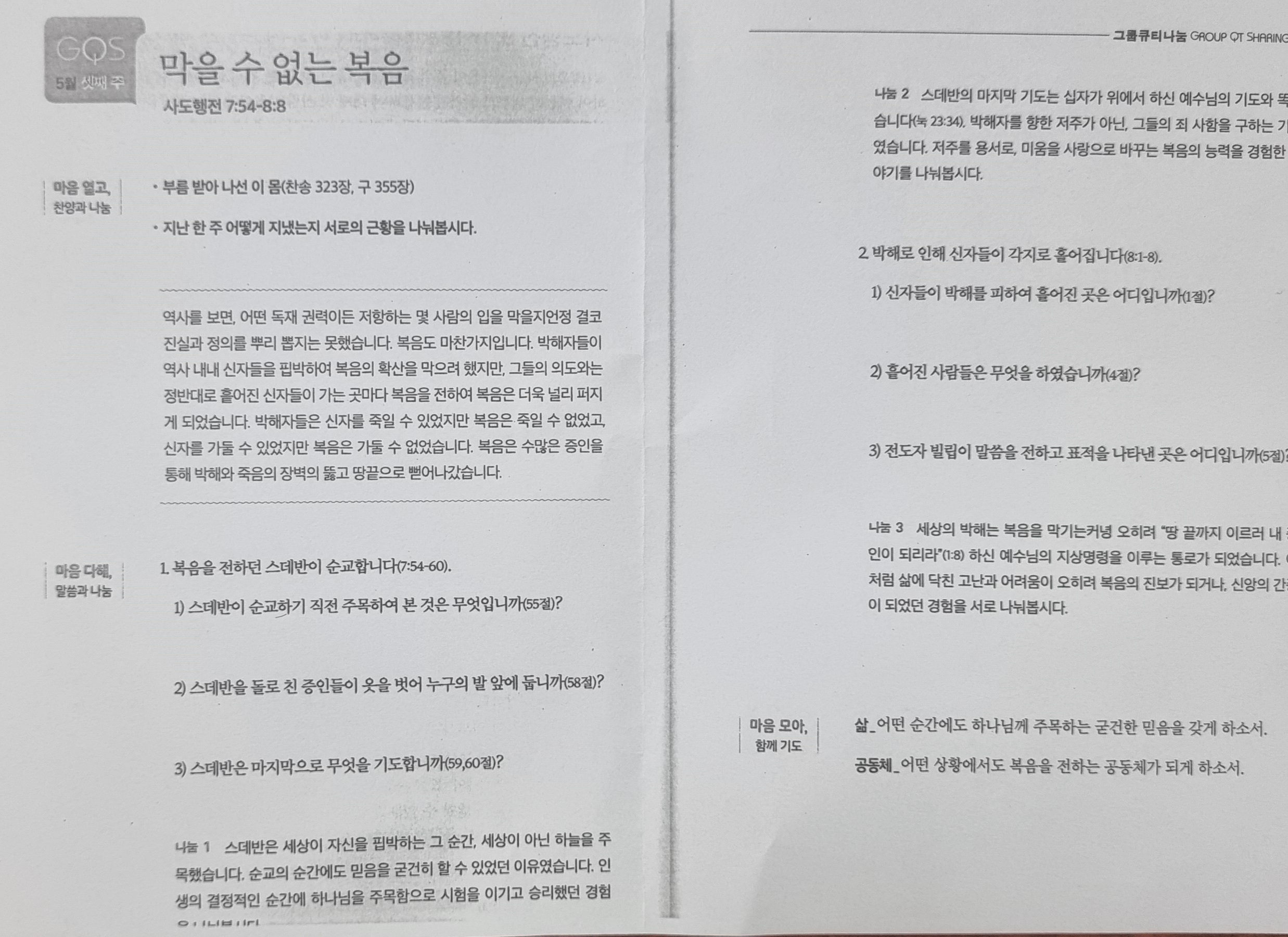 본 영상의 사이즈와 화질은 500kbps, 중간화질입니다. 영상은 업로드 시 설정할 수 있습니다. [성경본문] 사도행전7:54-60절 개역개정54. 그들이 이 말을 듣고 마음에 찔려 그를 향하여 이를 갈거늘 55. 스데반이 성령 충만하여 하늘을 우러러 주목하여 하나님의 영광과 및 예수께서 하나님 우편에 서신 것을 보고 56. 말하되 보라 하늘이 열리고 인자가 하나님 우편에 서신 것을 보노라 한대 57. 그들이 큰 소리를 지르며 귀를 막고 일제히 그에게 달려들어 58. 성 밖으로 내치고 돌로 칠새 증인들이 옷을 벗어 사울이라 하는 청년의 발 앞에 두니라 59. 그들이 돌로 스데반을 치니 스데반이 부르짖어 이르되 주 예수여 내 영혼을 받으시옵소서 하고 60. 무릎을 꿇고 크게 불러 이르되 주여 이 죄를 그들에게 돌리지 마옵소서 이 말을 하고 자니라 [성경본문] 사도행전8:1-8절 개역개정1. 사울은 그가 죽임 당함을 마땅히 여기더라 그 날에 예루살렘에 있는 교회에 큰 박해가 있어 사도 외에는 다 유대와 사마리아 모든 2. 경건한 사람들이 스데반을 장사하고 위하여 크게 울더라 3. 사울이 교회를 잔멸할새 각 집에 들어가 남녀를 끌어다가 옥에 넘기니라 4. 그 흩어진 사람들이 두루 다니며 복음의 말씀을 전할새 5. 빌립이 사마리아 성에 내려가 그리스도를 백성에게 전파하니 6. 무리가 빌립의 말도 듣고 행하는 표적도 보고 한마음으로 그가 하는 말을 따르더라 7. 많은 사람에게 붙었던 더러운 귀신들이 크게 소리를 지르며 나가고 또 많은 중풍병자와 못 걷는 사람이 나으니 8. 그 성에 큰 기쁨이 있더라 2024년 5월 셋째주 순장반공부 「막을 수 없는 복음」