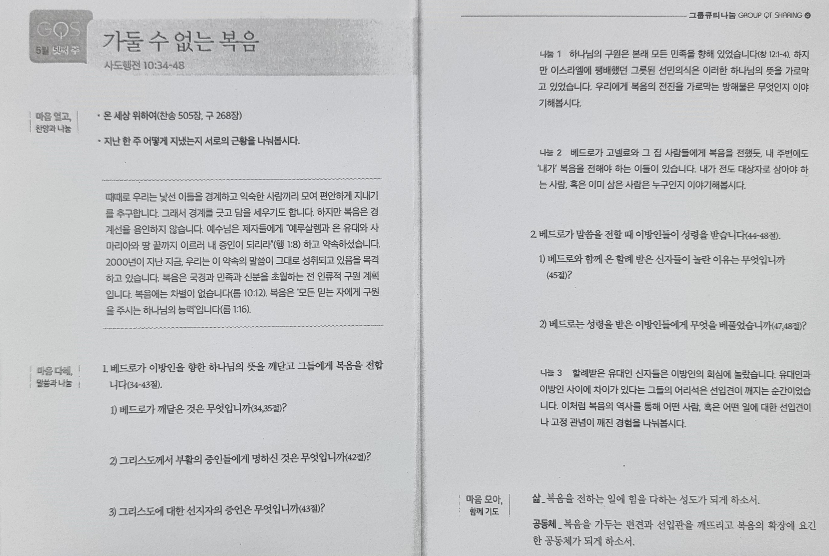 본 영상의 사이즈와 화질은 500kbps, 중간화질입니다. 영상은 업로드 시 설정할 수 있습니다. [성경본문] 사도행전10:34-48절 개역개정34. 베드로가 입을 열어 말하되 내가 참으로 하나님은 사람의 외모를 보지 아니하시고 35. 각 나라 중 하나님을 경외하며 의를 행하는 사람은 다 받으시는 줄 깨달았도다 36. 만유의 주 되신 예수 그리스도로 말미암아 화평의 복음을 전하사 이스라엘 자손들에게 보내신 말씀 37. 곧 요한이 그 세례를 반포한 후에 갈릴리에서 시작하여 온 유대에 두루 전파된 그것을 너희도 알거니와 38. 하나님이 나사렛 예수에게 성령과 능력을 기름 붓듯 하셨으매 그가 두루 다니시며 선한 일을 행하시고 마귀에게 눌린 모든 사람을 고치셨으니 이는 하나님이 함께 하셨음이라 39. 우리는 유대인의 땅과 예루살렘에서 그가 행하신 모든 일에 증인이라 그를 그들이 나무에 달아 죽였으나 40. 하나님이 사흘 만에 다시 살리사 나타내시되 41. 모든 백성에게 하신 것이 아니요 오직 미리 택하신 증인 곧 죽은 자 가운데서 부활하신 후 그를 모시고 음식을 먹은 우리에게 하신 것이라 42. 우리에게 명하사 백성에게 전도하되 하나님이 살아 있는 자와 죽은 자의 재판장으로 정하신 자가 곧 이 사람인 것을 증언하게 하셨고 43. 그에 대하여 모든 선지자도 증언하되 그를 믿는 사람들이 다 그의 이름을 힘입어 죄 사함을 받는다 하였느니라 44. 베드로가 이 말을 할 때에 성령이 말씀 듣는 모든 사람에게 내려오시니 45. 베드로와 함께 온 할례 받은 신자들이 이방인들에게도 성령 부어 주심으로 말미암아 놀라니 46. 이는 방언을 말하며 하나님 높임을 들음이러라 47. 이에 베드로가 이르되 이 사람들이 우리와 같이 성령을 받았으니 누가 능히 물로 세례 베풂을 금하리요 하고 48. 명하여 예수 그리스도의 이름으로 세례를 베풀라 하니라 그들이 베드로에게 며칠 더 머물기를 청하니라 2024년 5월 넷째주 순장반공부 「가둘 수 없는 복음」