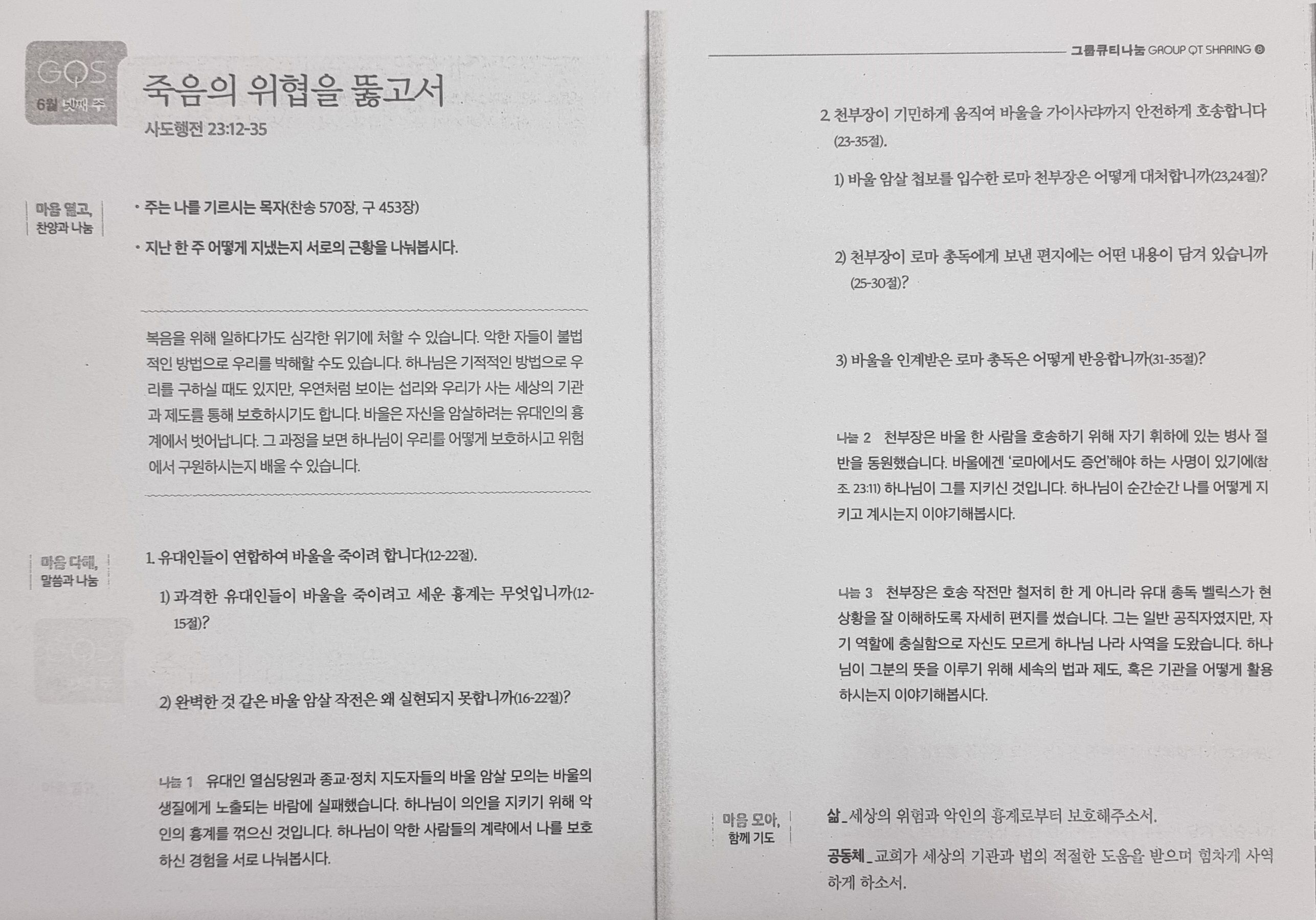 본 영상의 사이즈와 화질은 500kbps, 중간화질입니다. 영상은 업로드 시 설정할 수 있습니다. [성경본문] 사도행전23:12-35절 개역개정12. 날이 새매 유대인들이 당을 지어 맹세하되 바울을 죽이기 전에는 먹지도 아니하고 마시지도 아니하겠다 하고 13. 이같이 동맹한 자가 사십여 명이더라 14. 대제사장들과 장로들에게 가서 말하되 우리가 바울을 죽이기 전에는 아무 것도 먹지 않기로 굳게 맹세하였으니 15. 이제 너희는 그의 사실을 더 자세히 물어보려는 척하면서 공회와 함께 천부장에게 청하여 바울을 너희에게로 데리고 내려오게 하라 우리는 그가 가까이 오기 전에 죽이기로 준비하였노라 하더니 16. 바울의 생질이 그들이 매복하여 있다 함을 듣고 와서 영내에 들어가 바울에게 알린지라 17. 바울이 한 백부장을 청하여 이르되 이 청년을 천부장에게로 인도하라 그에게 무슨 할 말이 있다 하니 18. 천부장에게로 데리고 가서 이르되 죄수 바울이 나를 불러 이 청년이 당신께 할 말이 있다 하여 데리고 가기를 청하더이다 하매 19. 천부장이 그의 손을 잡고 물러가서 조용히 묻되 내게 할 말이 무엇이냐 20. 대답하되 유대인들이 공모하기를 그들이 바울에 대하여 더 자세한 것을 묻기 위함이라 하고 내일 그를 데리고 공회로 내려오기를 당신께 청하자 하였으니 21. 당신은 그들의 청함을 따르지 마옵소서 그들 중에서 바울을 죽이기 전에는 먹지도 않고 마시지도 않기로 맹세한 자 사십여 명이 그를 죽이려고 숨어서 지금 다 준비하고 당신의 허락만 기다리나이다 하니 22. 이에 천부장이 청년을 보내며 경계하되 이 일을 내게 알렸다고 아무에게도 이르지 말라 하고 23. 백부장 둘을 불러 이르되 밤 제 삼 시에 가이사랴까지 갈 보병 이백 명과 기병 칠십 명과 창병 이백 명을 준비하라 하고 24. 또 바울을 태워 총독 벨릭스에게로 무사히 보내기 위하여 짐승을 준비하라 명하며 25. 또 이 아래와 같이 편지하니 일렀으되 26. 글라우디오 루시아는 총독 벨릭스 각하께 문안하나이다 27. 이 사람이 유대인들에게 잡혀 죽게 된 것을 내가 로마 사람인 줄 들어 알고 군대를 거느리고 가서 구원하여다가 28. 유대인들이 무슨 일로 그를 고발하는지 알고자 하여 그들의 공회로 데리고 내려갔더니 29. 고발하는 것이 그들의 율법 문제에 관한 것뿐이요 한 가지도 죽이거나 결박할 사유가 없음을 발견하였나이다 30. 그러나 이 사람을 해하려는 간계가 있다고 누가 내게 알려 주기로 곧 당신께로 보내며 또 고발하는 사람들도 당신 앞에서 그에 대하여 말하라 하였나이다 하였더라 31. 보병이 명을 받은 대로 밤에 바울을 데리고 안디바드리에 이르러 32. 이튿날 기병으로 바울을 호송하게 하고 영내로 돌아가니라 33. 그들이 가이사랴에 들어가서 편지를 총독에게 드리고 바울을 그 앞에 세우니 34. 총독이 읽고 바울더러 어느 영지 사람이냐 물어 길리기아 사람인 줄 알고 35. 이르되 너를 고발하는 사람들이 오거든 네 말을 들으리라 하고 헤롯 궁에 그를 지키라 명하니라 2024년 6월 넷째주 순장반공부 「죽음의 위협을 뚫고서」