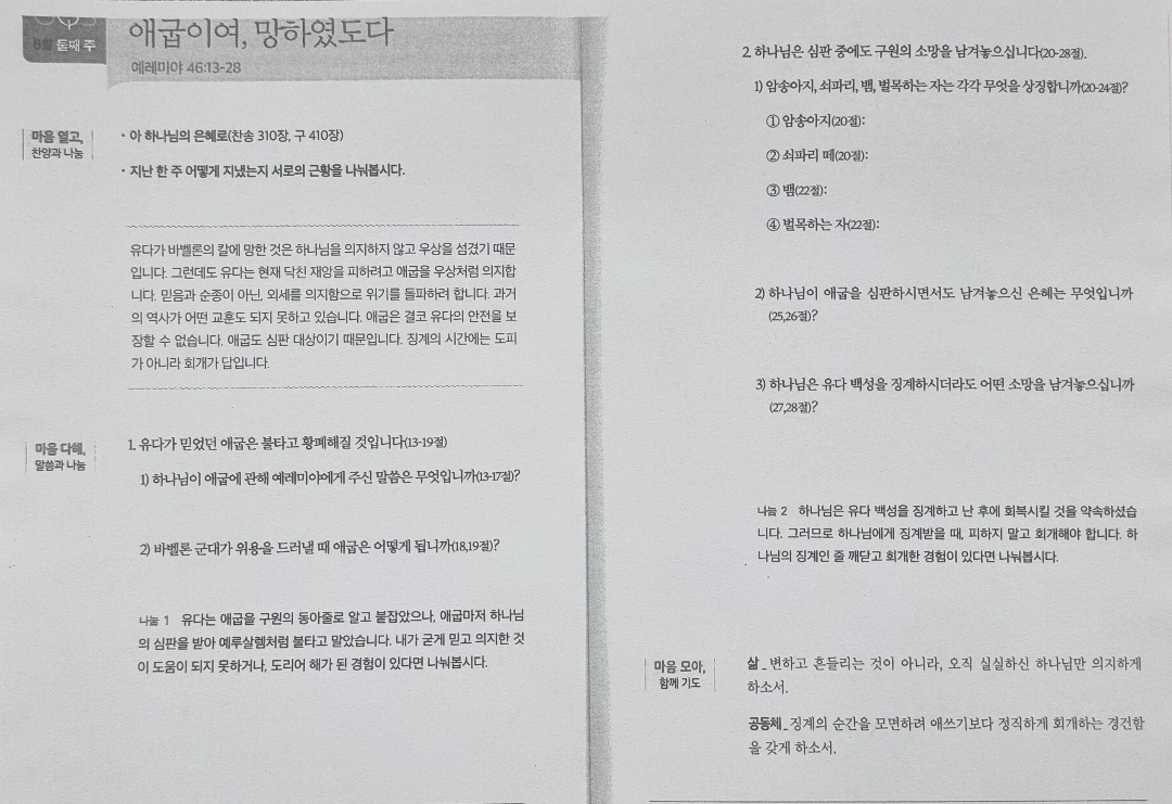 본 영상의 사이즈와 화질은 500kbps, 중간화질입니다. 영상은 업로드 시 설정할 수 있습니다. [성경본문] 예레미야46:13-28절 개역개정13. 바벨론의 느부갓네살 왕이 와서 애굽 땅을 칠 일에 대하여 선지자 예레미야에게 이르신 여호와의 말씀이라 14. 너희는 애굽에 선포하며 믹돌과 놉과 다바네스에 선포하여 말하기를 너희는 굳건히 서서 준비하라 네 사방이 칼에 삼키웠느니라 15. 너희 장사들이 쓰러짐은 어찌함이냐 그들이 서지 못함은 여호와께서 그들을 몰아내신 까닭이니라 16. 그가 많은 사람을 넘어지게 하시매 사람이 사람 위에 엎드러지며 이르되 일어나라 우리가 포악한 칼을 피하여 우리 민족에게로, 우리 고향으로 돌아가자 하도다 17. 그들이 그 곳에서 부르짖기를 애굽의 바로 왕이 망하였도다 그가 기회를 놓쳤도다 18. 만군의 여호와라 일컫는 왕이 이르시되 나의 삶으로 맹세하노니 그가 과연 산들 중의 다볼 같이, 해변의 갈멜 같이 오리라 19. 애굽에 사는 딸이여 너는 너를 위하여 포로의 짐을 꾸리라 놉이 황무하며 불에 타서 주민이 없을 것임이라 20. 애굽은 심히 아름다운 암송아지일지라도 북으로부터 쇠파리 떼가 줄곧 오리라 21. 또 그 중의 고용꾼은 살진 수송아지 같아서 돌이켜 함께 도망하고 서지 못하였나니 재난의 날이 이르렀고 벌 받는 때가 왔음이라 22. 애굽의 소리가 뱀의 소리 같으리니 이는 그들의 군대가 벌목하는 자 같이 도끼를 가지고 올 것임이라 23. 여호와의 말씀이니라 그들이 황충보다 많아서 셀 수 없으므로 조사할 수 없는 그의 수풀을 찍을 것이라 24. 딸 애굽이 수치를 당하여 북쪽 백성의 손에 붙임을 당하리로다 25. 만군의 여호와 이스라엘의 하나님께서 말씀하시니라 보라 내가 노의 아몬과 바로와 애굽과 애굽 신들과 왕들 곧 바로와 및 그를 의지하는 자들을 벌할 것이라 26. 내가 그들의 생명을 노리는 자의 손 곧 바벨론의 느부갓네살 왕의 손과 그 종들의 손에 넘기리라 그럴지라도 그 후에는 그 땅이 이전 같이 사람 살 곳이 되리라 여호와의 말씀이니라 27. 내 종 야곱아 두려워하지 말라 이스라엘아 놀라지 말라 보라 내가 너를 먼 곳에서 구원하며 네 자손을 포로된 땅에서 구원하리니 28. 여호와의 말씀이니라 내 종 야곱아 내가 너와 함께 있나니 두려워하지 말라 내가 너를 흩었던 그 나라들은 다 멸할지라도 너는 사라지지 아니하리라 내가 너를 법도대로 징계할 것이요 결코 무죄한 자로 여기지 아니하리라 하시니라 2024년 8월 둘째주 순장반공부 〔애굽이여,망하였도다〕