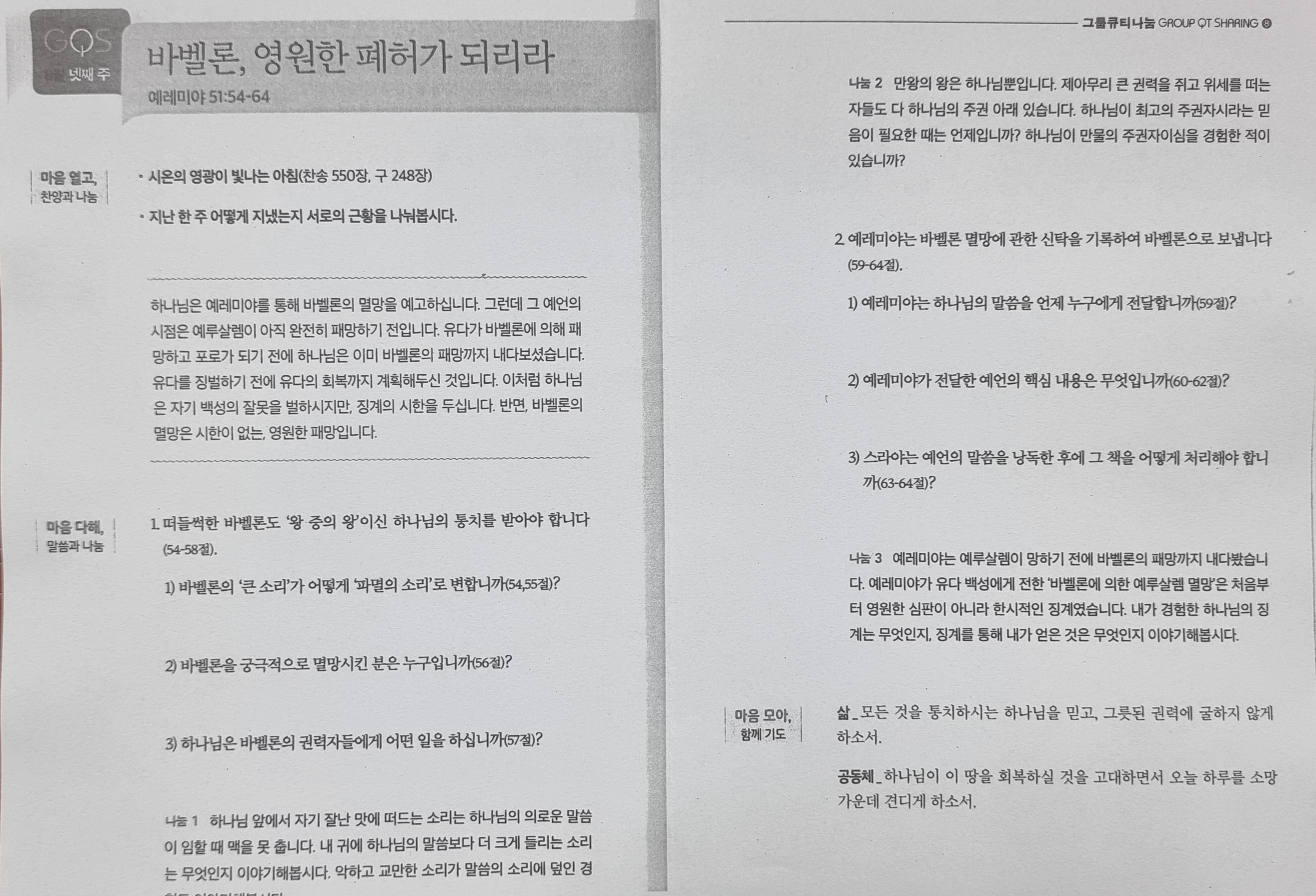 본 영상의 사이즈와 화질은 500kbps, 중간화질입니다. 영상은 업로드 시 설정할 수 있습니다. [성경본문] 예레미야51:54-64절 개역개정54. 바벨론으로부터 부르짖는 소리가 들리도다 갈대아 사람의 땅에 큰 파멸의 소리가 들리도다 55. 이는 여호와께서 바벨론을 황폐하게 하사 그 큰 소리를 끊으심이로다 원수는 많은 물 같이 그 파도가 사나우며 그 물결은 요란한 소리를 내는도다 56. 곧 멸망시키는 자가 바벨론에 이르렀음이라 그 용사들이 사로잡히고 그들의 활이 꺾이도다 여호와는 보복의 하나님이시니 반드시 보응하시리로다 57. 만군의 여호와라 일컫는 왕이 이와 같이 말씀하시되 내가 그 고관들과 지혜 있는 자들과 도백들과 태수들과 용사들을 취하게 하리니 그들이 영원히 잠들어 깨어나지 못하리라 58. 만군의 여호와께서 이와 같이 말씀하시니라 바벨론의 성벽은 훼파되겠고 그 높은 문들은 불에 탈 것이며 백성들의 수고는 헛될 것이요 민족들의 수고는 불탈 것인즉 그들이 쇠잔하리라 59. 유다의 시드기야 왕 제사년에 마세야의 손자 네리야의 아들 스라야가 그 왕과 함께 바벨론으로 갈 때에 선지자 예레미야가 그에게 60. 예레미야가 바벨론에 닥칠 모든 재난 곧 바벨론에 대하여 기록한 이 모든 말씀을 한 책에 기록하고 61. 스라야에게 말하기를 너는 바벨론에 이르거든 삼가 이 모든 말씀을 읽고 62. 말하기를 여호와여 주께서 이 곳에 대하여 말씀하시기를 이 땅을 멸하여 사람이나 짐승이 거기에 살지 못하게 하고 영원한 폐허가 되리라 하셨나이다 하라 하니라 63. 너는 이 책 읽기를 다한 후에 책에 돌을 매어 유브라데 강 속에 던지며 64. 말하기를 바벨론이 나의 재난 때문에 이같이 몰락하여 다시 일어서지 못하리니 그들이 피폐하리라 하라 하니라 예레미야의 말이 이에 끝나니라 2024년 8월 넷째주 순장반공부 「바벨론, 영원한 폐허가 되리라」