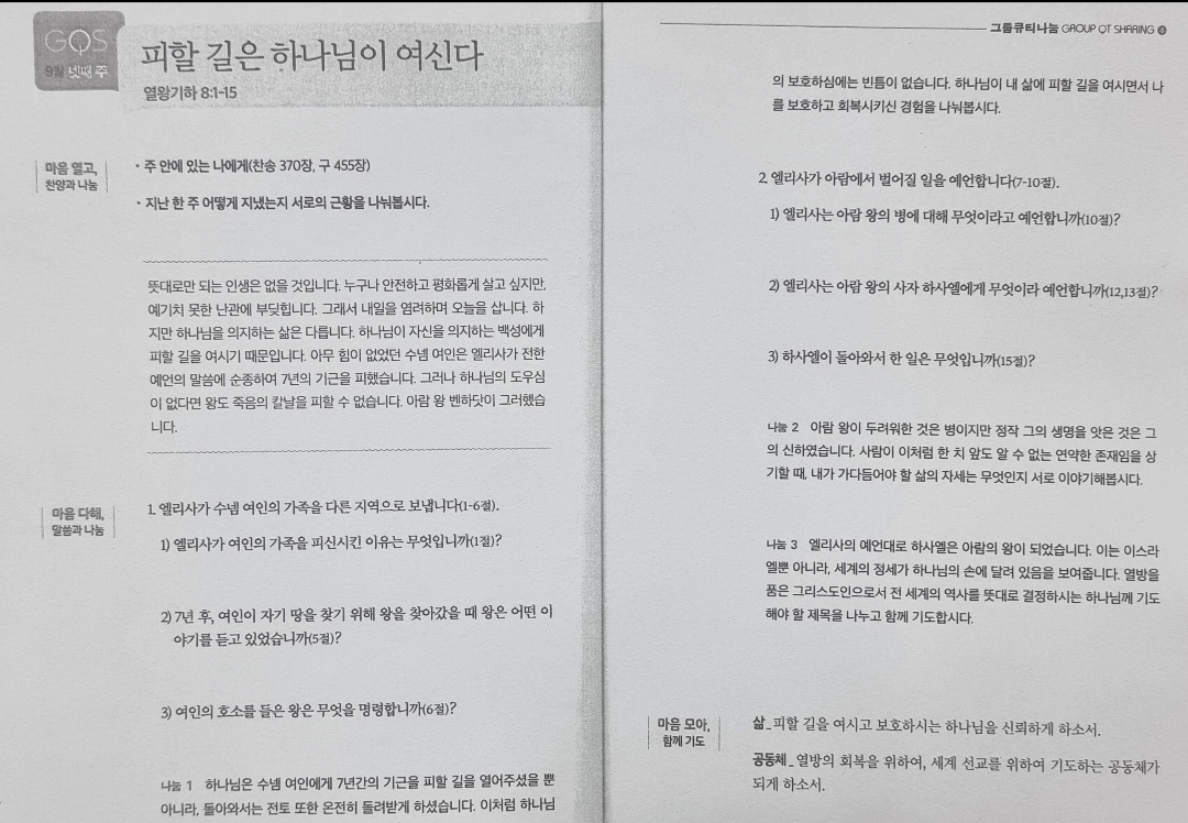본 영상의 사이즈와 화질은 500kbps, 중간화질입니다. 영상은 업로드 시 설정할 수 있습니다. [성경본문] 열왕기하8:1-15절 개역개정1. 엘리사가 이전에 아들을 다시 살려 준 여인에게 이르되 너는 일어나서 네 가족과 함께 거주할 만한 곳으로 가서 거주하라 여호와께서 기근을 부르셨으니 그대로 이 땅에 칠 년 동안 임하리라 하니 2. 여인이 일어나서 하나님의 사람의 말대로 행하여 그의 가족과 함께 가서 블레셋 사람들의 땅에 칠 년을 우거하다가 3. 칠 년이 다하매 여인이 블레셋 사람들의 땅에서 돌아와 자기 집과 전토를 위하여 호소하려 하여 왕에게 나아갔더라 4. 그 때에 왕이 하나님의 사람의 사환 게하시와 서로 말하며 이르되 너는 엘리사가 행한 모든 큰 일을 내게 설명하라 하니 5. 게하시가 곧 엘리사가 죽은 자를 다시 살린 일을 왕에게 이야기할 때에 그 다시 살린 아이의 어머니가 자기 집과 전토를 위하여 왕에게 호소하는지라 게하시가 이르되 내 주 왕이여 이는 그 여인이요 저는 그의 아들이니 곧 엘리사가 다시 살린 자니이다 하니라 6. 왕이 그 여인에게 물으매 여인이 설명한지라 왕이 그를 위하여 한 관리를 임명하여 이르되 이 여인에게 속한 모든 것과 이 땅에서 떠날 때부터 이제까지 그의 밭의 소출을 다 돌려 주라 하였더라 7. 엘리사가 다메섹에 갔을 때에 아람 왕 벤하닷이 병들었더니 왕에게 들리기를 이르되 하나님의 사람이 여기 이르렀나이다 하니 8. 왕이 하사엘에게 이르되 너는 손에 예물을 가지고 가서 하나님의 사람을 맞이하고 내가 이 병에서 살아나겠는지 그를 통하여 여호와께 물으라 9. 하사엘이 그를 맞이하러 갈새 다메섹의 모든 좋은 물품으로 예물을 삼아 가지고 낙타 사십 마리에 싣고 나아가서 그의 앞에 서서 이르되 당신의 아들 아람 왕 벤하닷이 나를 당신에게 보내 이르되 나의 이 병이 낫겠나이까 하더이다 하니 10. 엘리사가 이르되 너는 가서 그에게 말하기를 왕이 반드시 나으리라 하라 그러나 여호와께서 그가 반드시 죽으리라고 내게 알게 하셨느니라 하고 11. 하나님의 사람이 그가 부끄러워하기까지 그의 얼굴을 쏘아보다가 우니 12. 하사엘이 이르되 내 주여 어찌하여 우시나이까 하는지라 대답하되 네가 이스라엘 자손에게 행할 모든 악을 내가 앎이라 네가 그들의 성에 불을 지르며 장정을 칼로 죽이며 어린 아이를 메치며 아이 밴 부녀를 가르리라 하니 13. 하사엘이 이르되 당신의 개 같은 종이 무엇이기에 이런 큰일을 행하오리이까 하더라 엘리사가 대답하되 여호와께서 네가 아람 왕이 될 것을 내게 알게 하셨느니라 하더라 14. 그가 엘리사를 떠나가서 그의 주인에게 나아가니 왕이 그에게 묻되 엘리사가 네게 무슨 말을 하더냐 하니 대답하되 그가 내게 이르기를 왕이 반드시 살아나시리이다 하더이다 하더라 15. 그 이튿날에 하사엘이 이불을 물에 적시어 왕의 얼굴에 덮으매 왕이 죽은지라 그가 대신하여 왕이 되니라 2024년 9월 넷째주 순장반 공부 「피할 길은 하나님이 여신다」