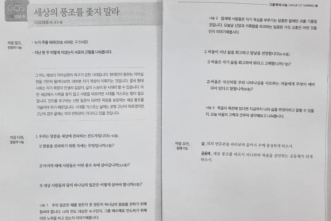본 영상의 사이즈와 화질은 500kbps, 중간화질입니다. 영상은 업로드 시 설정할 수 있습니다. [성경본문] 디모데후서4:1-8절 개역개정1. 하나님 앞과 살아 있는 자와 죽은 자를 심판하실 그리스도 예수 앞에서 그가 나타나실 것과 그의 나라를 두고 엄히 명하노니 2. 너는 말씀을 전파하라 때를 얻든지 못 얻든지 항상 힘쓰라 범사에 오래 참음과 가르침으로 경책하며 경계하며 권하라 3. 때가 이르리니 사람이 바른 교훈을 받지 아니하며 귀가 가려워서 자기의 사욕을 따를 스승을 많이 두고 4. 또 그 귀를 진리에서 돌이켜 허탄한 이야기를 따르리라 5. 그러나 너는 모든 일에 신중하여 고난을 받으며 전도자의 일을 하며 네 직무를 다하라 6. 전제와 같이 내가 벌써 부어지고 나의 떠날 시각이 가까웠도다 7. 나는 선한 싸움을 싸우고 나의 달려갈 길을 마치고 믿음을 지켰으니 8. 이제 후로는 나를 위하여 의의 면류관이 예비되었으므로 주 곧 의로우신 재판장이 그 날에 내게 주실 것이며 내게만 아니라 주의 나타나심을 사모하는 모든 자에게도니라 2024년 11월 넷째주 순장반공부 「세상 풍조를 좇지마라」