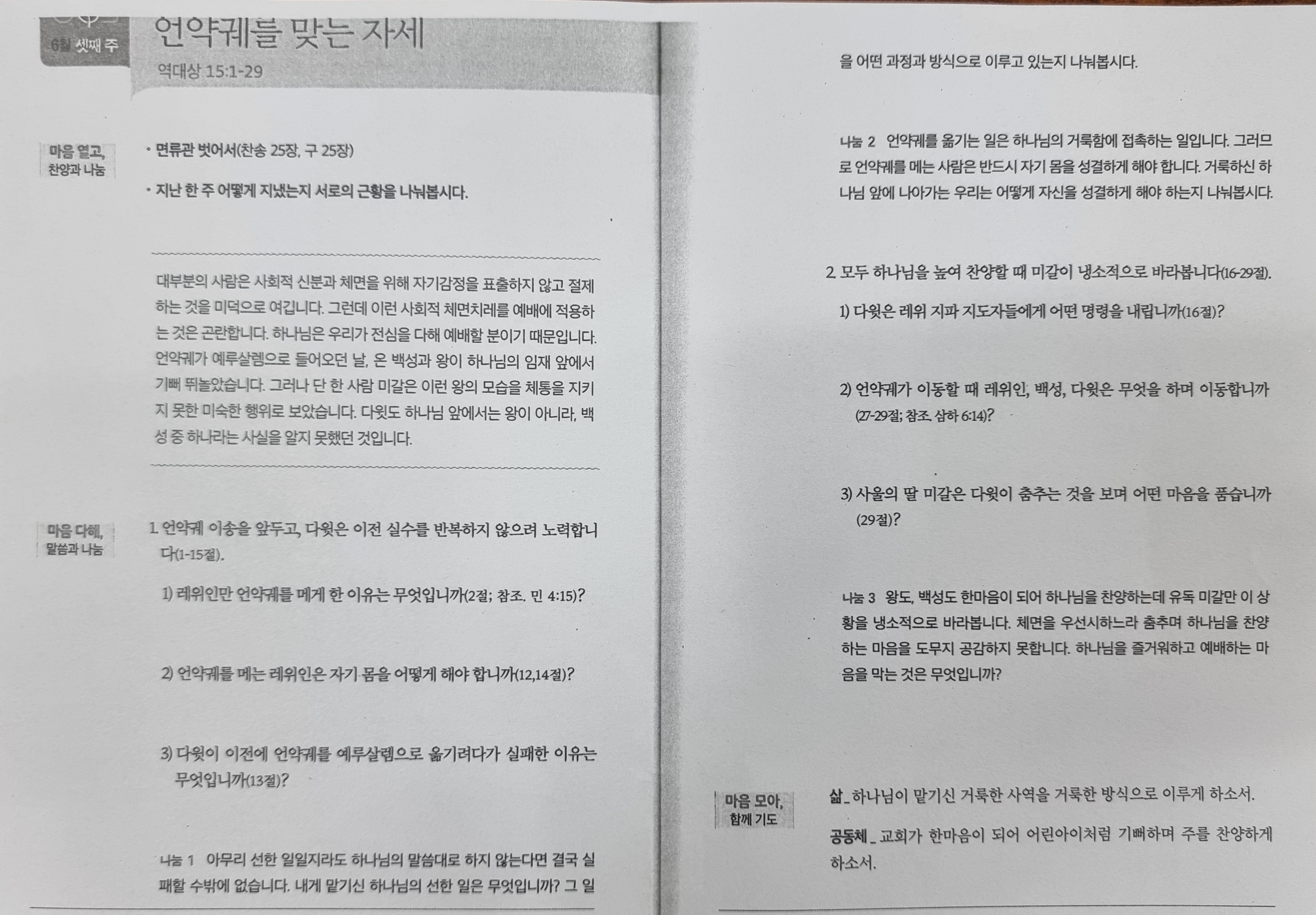 본 영상의 사이즈와 화질은 500kbps, 중간화질입니다. 영상은 업로드 시 설정할 수 있습니다. [성경본문] 역대상15:1-29절 개역개정1. 다윗이 다윗 성에서 자기를 위하여 궁전을 세우고 또 하나님의 궤를 둘 곳을 마련하고 그것을 위하여 장막을 치고 2. 다윗이 이르되 레위 사람 외에는 하나님의 궤를 멜 수 없나니 이는 여호와께서 그들을 택하사 여호와의 궤를 메고 영원히 그를 섬기게 하셨음이라 하고 3. 다윗이 이스라엘 온 무리를 예루살렘으로 모으고 여호와의 궤를 그 마련한 곳으로 메어 올리고자 하여 4. 다윗이 아론 자손과 레위 사람을 모으니 5. 그핫 자손 중에 지도자 우리엘과 그의 형제가 백이십 명이요 6. 므라리 자손 중에 지도자 아사야와 그의 형제가 이백이십 명이요 7. 게르솜 자손 중에 지도자 요엘과 그의 형제가 백삼십 명이요 8. 엘리사반 자손 중에 지도자 스마야와 그의 형제가 이백 명이요 9. 헤브론 자손 중에 지도자 엘리엘과 그의 형제가 팔십 명이요 10. 웃시엘 자손 중에 지도자 암미나답과 그의 형제가 백십이 명이라 11. 다윗이 제사장 사독과 아비아달을 부르고 또 레위 사람 우리엘과 아사야와 요엘과 스마야와 엘리엘과 암미나답을 불러 12. 그들에게 이르되 너희는 레위 사람의 지도자이니 너희와 너희 형제는 몸을 성결하게 하고 내가 마련한 곳으로 이스라엘의 하나님 여호와의 궤를 메어 올리라 13. 전에는 너희가 메지 아니하였으므로 우리 하나님 여호와께서 우리를 찢으셨으니 이는 우리가 규례대로 그에게 구하지 아니하였음이라 하니 14. 이에 제사장들과 레위 사람들이 이스라엘 하나님 여호와의 궤를 메고 올라가려 하여 몸을 성결하게 하고 15. 모세가 여호와의 말씀을 따라 명령한 대로 레위 자손이 채에 하나님의 궤를 꿰어 어깨에 메니라 16. 다윗이 레위 사람의 어른들에게 명령하여 그의 형제들을 노래하는 자들로 세우고 비파와 수금과 제금 등의 악기를 울려서 즐거운 소리를 크게 내라 하매 17. 레위 사람이 요엘의 아들 헤만과 그의 형제 중 베레야의 아들 아삽과 그의 형제 므라리 자손 중에 구사야의 아들 에단을 세우고 18. 그 다음으로 그들의 형제 스가랴와 벤과 야아시엘과 스미라못과 여히엘과 운니와 엘리압과 브나야와 마아세야와 맛디디야와 엘리블레후와 믹네야와 문지기 오벧에돔과 여이엘을 세우니 19. 노래하는 자 헤만과 아삽과 에단은 놋제금을 크게 치는 자요 20. 스가랴와 아시엘과 스미라못과 여히엘과 운니와 엘리압과 마아세야와 브나야는 비파를 타서 알라못에 맞추는 자요 21. 맛디디야와 엘리블레후와 믹네야와 오벧에돔과 여이엘과 아사시야는 수금을 타서 여덟째 음에 맞추어 인도하는 자요 22. 레위 사람의 지도자 그나냐는 노래에 익숙하므로 노래를 인도하는 자요 23. 베레갸와 엘가나는 궤 앞에서 문을 지키는 자요 24. 제사장 스바냐와 요사밧과 느다넬과 아미새와 스가랴와 브나야와 엘리에셀은 하나님의 궤 앞에서 나팔을 부는 자요 오벧에돔과 여히야는 궤 앞에서 문을 지키는 자이더라 25. 이에 다윗과 이스라엘 장로들과 천부장들이 가서 여호와의 언약궤를 즐거이 메고 오벧에돔의 집에서 올라왔는데 26. 하나님이 여호와의 언약궤를 멘 레위 사람을 도우셨으므로 무리가 수송아지 일곱 마리와 숫양 일곱 마리로 제사를 드렸더라 27. 다윗과 및 궤를 멘 레위 사람과 노래하는 자와 그의 우두머리 그나냐와 모든 노래하는 자도 다 세마포 겉옷을 입었으며 다윗은 또 베 에봇을 입었고 28. 이스라엘 무리는 크게 부르며 뿔나팔과 나팔을 불며 제금을 치며 비파와 수금을 힘있게 타며 여호와의 언약궤를 메어 올렸더라 29. 여호와의 언약궤가 다윗 성으로 들어올 때에 사울의 딸 미갈이 창으로 내다보다가 다윗 왕이 춤추며 뛰노는 것을 보고 그 마음에 업신여겼더라 2025년 6월 셋째주 순장반공부 「언약궤를 맞는 자세」