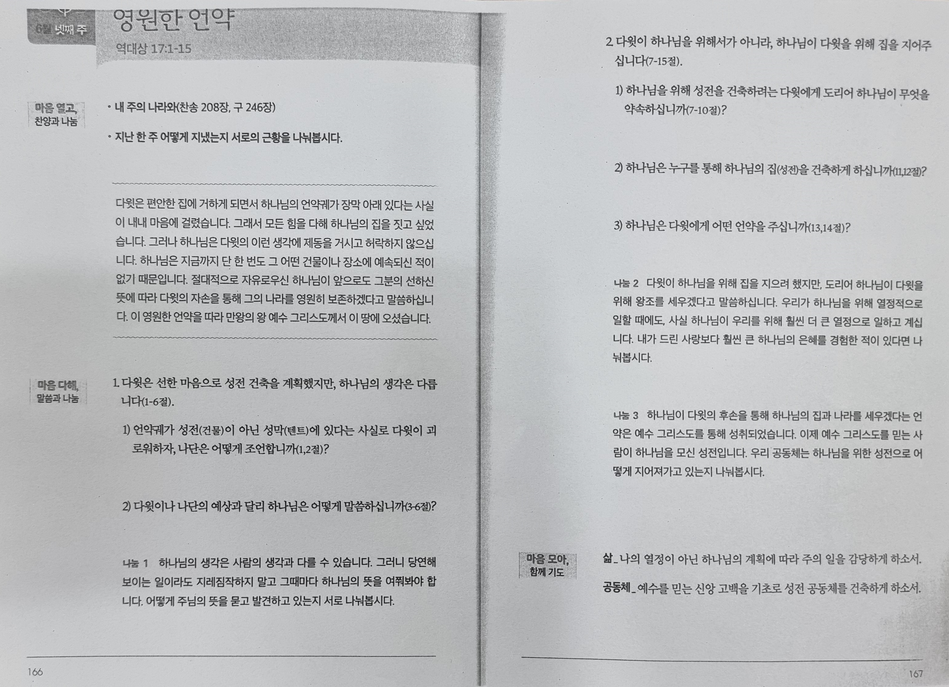 본 영상의 사이즈와 화질은 500kbps, 중간화질입니다. 영상은 업로드 시 설정할 수 있습니다. [성경본문] 역대상17:1-15절 개역개정1. 다윗이 그의 궁전에 거주할 때에 다윗이 선지자 나단에게 이르되 나는 백향목 궁에 거주하거늘 여호와의 언약궤는 휘장 아래에 있 2. 나단이 다윗에게 아뢰되 하나님이 왕과 함께 계시니 마음에 있는 바를 모두 행하소서 3. 그 밤에 하나님의 말씀이 나단에게 임하여 이르시되 4. 가서 내 종 다윗에게 말하기를 여호와의 말씀이 너는 내가 거할 집을 건축하지 말라 5. 내가 이스라엘을 애굽에서 올라오게 한 날부터 오늘까지 집에 있지 아니하고 오직 이 장막과 저 장막에 있으며 이 성막과 저 성막에 있었나니 6. 이스라엘 무리와 더불어 가는 모든 곳에서 내가 내 백성을 먹이라고 명령한 이스라엘 어느 사사에게 내가 말하기를 너희가 어찌하여 내 백향목 집을 건축하지 아니하였느냐고 말하였느냐 하고 7. 또한 내 종 다윗에게 이처럼 말하라 만군의 여호와께서 이처럼 말씀하시기를 내가 너를 목장 곧 양 떼를 따라다니던 데에서 데려다가 내 백성 이스라엘의 주권자로 삼고 8. 네가 어디로 가든지 내가 너와 함께 있어 네 모든 대적을 네 앞에서 멸하였은즉 세상에서 존귀한 자들의 이름 같은 이름을 네게 만들어 주리라 9. 내가 또 내 백성 이스라엘을 위하여 한 곳을 정하여 그들을 심고 그들이 그 곳에 거주하면서 다시는 옮겨가지 아니하게 하며 악한 사람들에게 전과 같이 그들을 해치지 못하게 하여 10. 전에 내가 사사에게 명령하여 내 백성 이스라엘을 다스리던 때와 같지 아니하게 하고 또 네 모든 대적으로 네게 복종하게 하리라 또 네게 이르노니 여호와가 너를 위하여 한 왕조를 세울지라 11. 네 생명의 연한이 차서 네가 조상들에게로 돌아가면 내가 네 뒤에 네 씨 곧 네 아들 중 하나를 세우고 그 나라를 견고하게 하리니 12. 그는 나를 위하여 집을 건축할 것이요 나는 그의 왕위를 영원히 견고하게 하리라 13. 나는 그의 아버지가 되고 그는 나의 아들이 되리니 나의 인자를 그에게서 빼앗지 아니하기를 내가 네 전에 있던 자에게서 빼앗음과 같이 하지 아니할 것이며 14. 내가 영원히 그를 내 집과 내 나라에 세우리니 그의 왕위가 영원히 견고하리라 하셨다 하라 15. 나단이 이 모든 말씀과 이 모든 계시대로 다윗에게 전하니라 2025년 6월 넷째주 순장반공부 「영원한 언약」