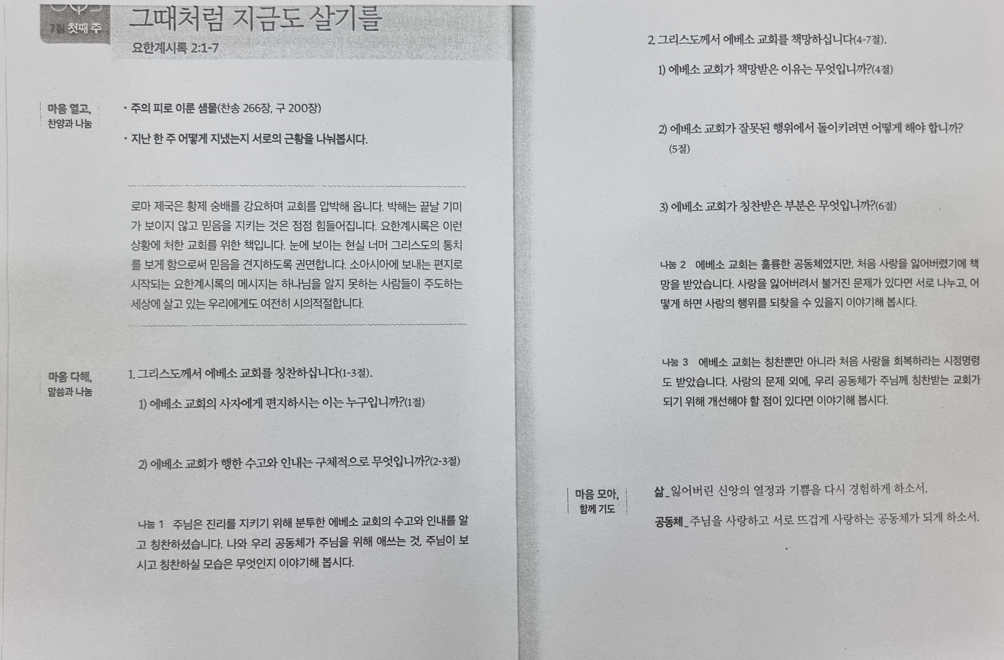 본 영상의 사이즈와 화질은 500kbps, 중간화질입니다. 영상은 업로드 시 설정할 수 있습니다. [성경본문] 요한계시록2:1-7절 개역개정1. 에베소 교회의 사자에게 편지하라 오른손에 있는 일곱 별을 붙잡고 일곱 금 촛대 사이를 거니시는 이가 이르시되 2. 내가 네 행위와 수고와 네 인내를 알고 또 악한 자들을 용납하지 아니한 것과 자칭 사도라 하되 아닌 자들을 시험하여 그의 거짓된 것을 네가 드러낸 것과 3. 또 네가 참고 내 이름을 위하여 견디고 게으르지 아니한 것을 아노라 4. 그러나 너를 책망할 것이 있나니 너의 처음 사랑을 버렸느니라 5. 그러므로 어디서 떨어졌는지를 생각하고 회개하여 처음 행위를 가지라 만일 그리하지 아니하고 회개하지 아니하면 내가 네게 가서 네 촛대를 그 자리에서 옮기리라 6. 오직 네게 이것이 있으니 네가 니골라 당의 행위를 미워하는도다 나도 이것을 미워하노라 7. 귀 있는 자는 성령이 교회들에게 하시는 말씀을 들을지어다 이기는 그에게는 내가 하나님의 낙원에 있는 생명나무의 열매를 주어 먹게 하리라 2025년 7월 첫째주 순장반공부 「그때처럼 지금도 살기를」