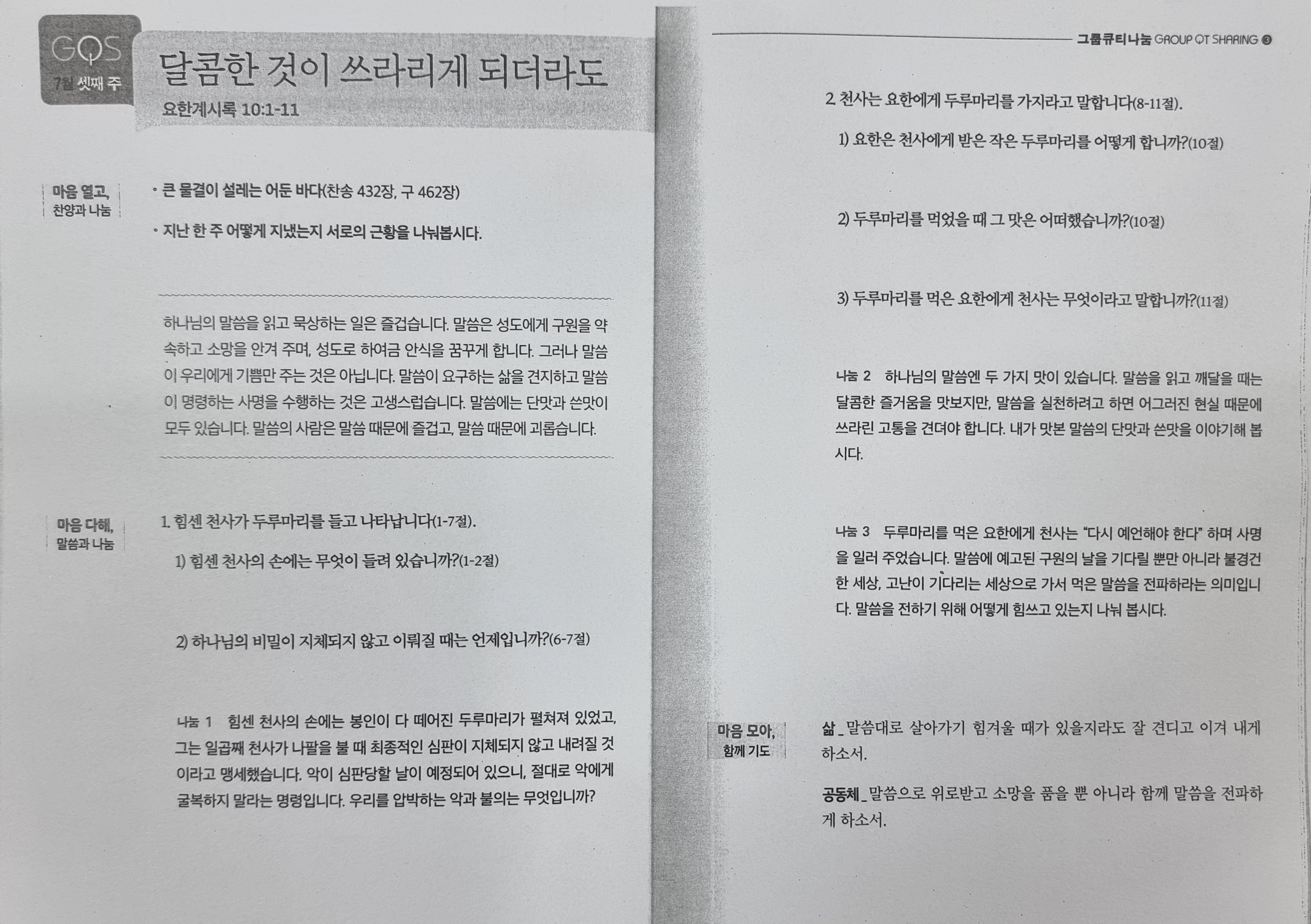 본 영상의 사이즈와 화질은 500kbps, 중간화질입니다. 영상은 업로드 시 설정할 수 있습니다. [성경본문] 요한계시록10:1-11절 개역개정1. 내가 또 보니 힘 센 다른 천사가 구름을 입고 하늘에서 내려오는데 그 머리 위에 무지개가 있고 그 얼굴은 해 같고 그 발은 불기 2. 그 손에는 펴 놓인 작은 두루마리를 들고 그 오른 발은 바다를 밟고 왼 발은 땅을 밟고 3. 사자가 부르짖는 것 같이 큰 소리로 외치니 그가 외칠 때에 일곱 우레가 그 소리를 내어 말하더라 4. 일곱 우레가 말을 할 때에 내가 기록하려고 하다가 곧 들으니 하늘에서 소리가 나서 말하기를 일곱 우레가 말한 것을 인봉하고 기록하지 말라 하더라 5. 내가 본 바 바다와 땅을 밟고 서 있는 천사가 하늘을 향하여 오른손을 들고 6. 세세토록 살아 계신 이 곧 하늘과 그 가운데에 있는 물건이며 땅과 그 가운데에 있는 물건이며 바다와 그 가운데에 있는 물건을 창조하신 이를 가리켜 맹세하여 이르되 지체하지 아니하리니 7. 일곱째 천사가 소리 내는 날 그의 나팔을 불려고 할 때에 하나님이 그의 종 선지자들에게 전하신 복음과 같이 하나님의 그 비밀이 이루어지리라 하더라 8. 하늘에서 나서 내게 들리던 음성이 또 내게 말하여 이르되 네가 가서 바다와 땅을 밟고 서 있는 천사의 손에 펴 놓인 두루마리를 가지라 하기로 9. 내가 천사에게 나아가 작은 두루마리를 달라 한즉 천사가 이르되 갖다 먹어 버리라 네 배에는 쓰나 네 입에는 꿀 같이 달리라 하거늘 10. 내가 천사의 손에서 작은 두루마리를 갖다 먹어 버리니 내 입에는 꿀 같이 다나 먹은 후에 내 배에서는 쓰게 되더라 11. 그가 내게 말하기를 네가 많은 백성과 나라와 방언과 임금에게 다시 예언하여야 하리라 하더라 2025년 7월 셋째주 순장반공부 「달콤한 것이 쓰라리게 되더라」